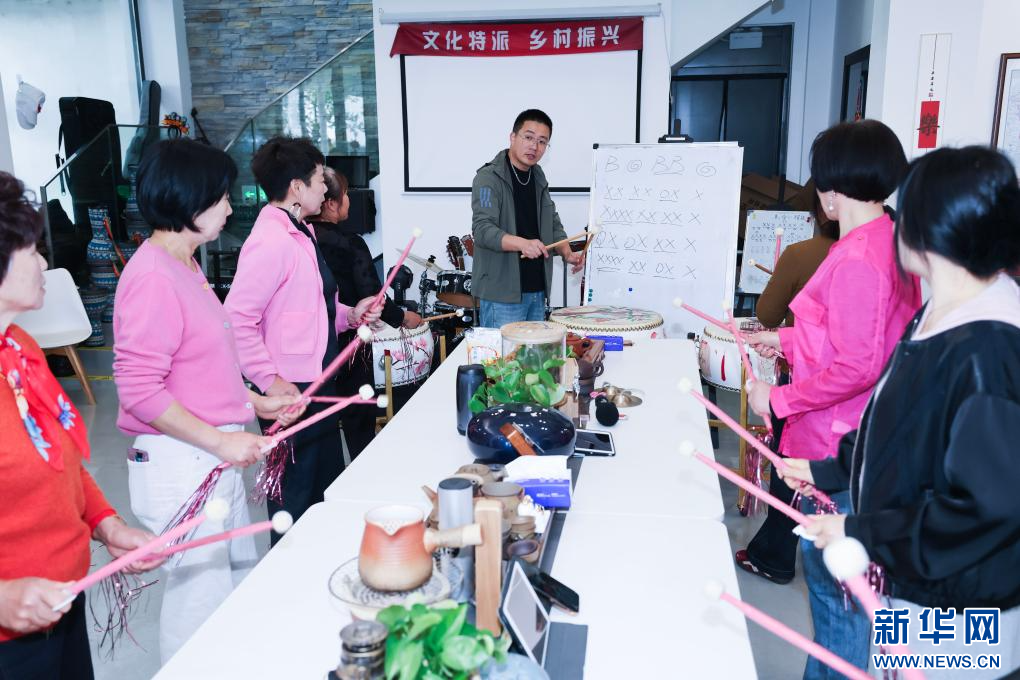 4月8日,在嘉兴市南湖区凤桥镇联丰村王祥里音乐学苑,毕业于上海音乐学院的青年音乐主理人金文凯(中)正带领凤桥农民丰收鼓乐团排练,为演出作准备。