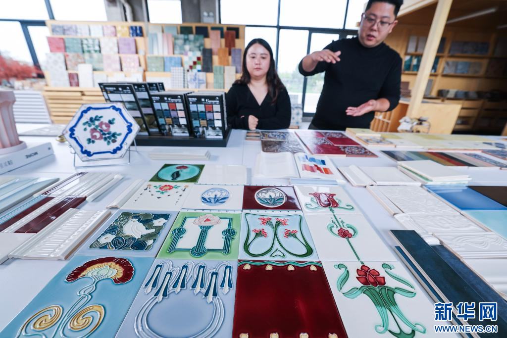 4月8日,嘉兴市南湖区余新镇长秦村千品创岩瓷砖工作室,负责人朱小冬(右)在介绍瓷砖设计理念。