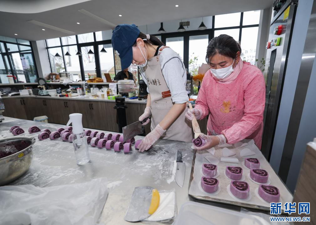 4月8日,在嘉兴市南湖区余新镇长秦村的“馒头酵主”创意馒头店内,店主沈峰(左)跟工作人员一起制作新中式馒头。该馒头店根据客户的订单制作不同风格口味的馒头,销售渠道以网上为主线下为辅,客户大多为年轻市民。
