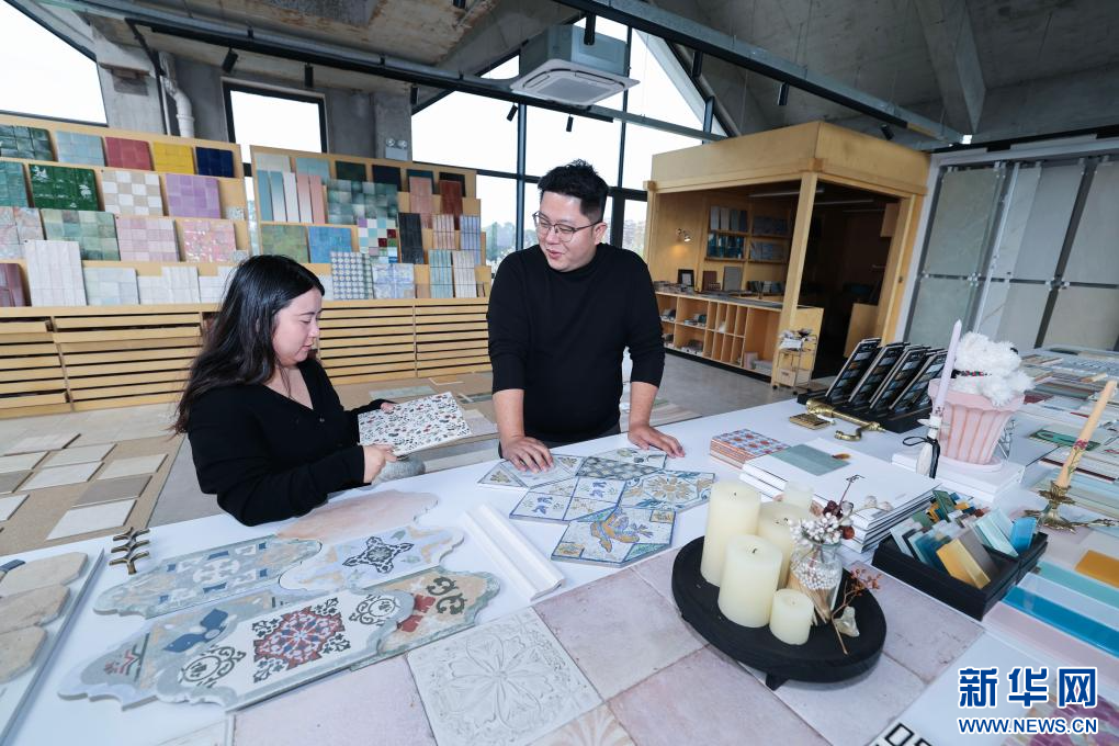 4月8日,嘉兴市南湖区余新镇长秦村千品创岩瓷砖工作室,负责人朱小冬(右)在研究瓷砖设计。