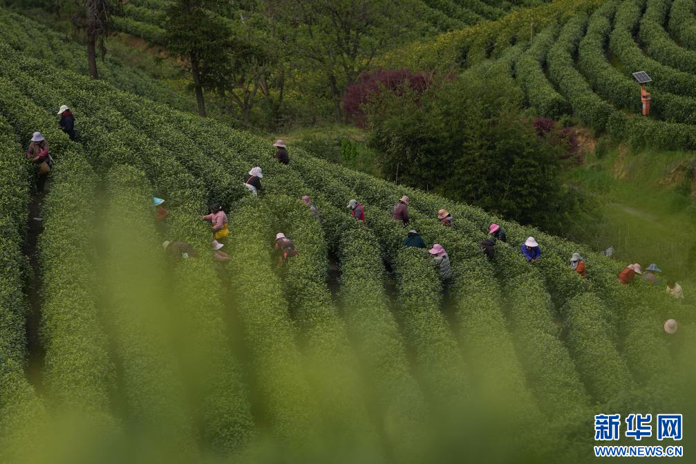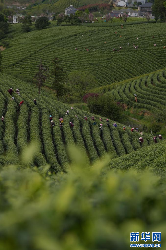 4月8日,采茶工在浙江省安吉县溪龙乡黄杜村的茶山采摘白茶青叶。