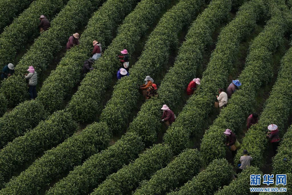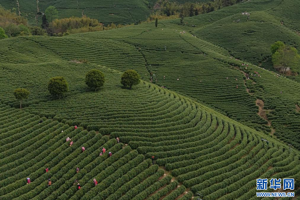 4月8日,采茶工在浙江省安吉县溪龙乡黄杜村的茶山采摘白茶青叶(无人机照片)。