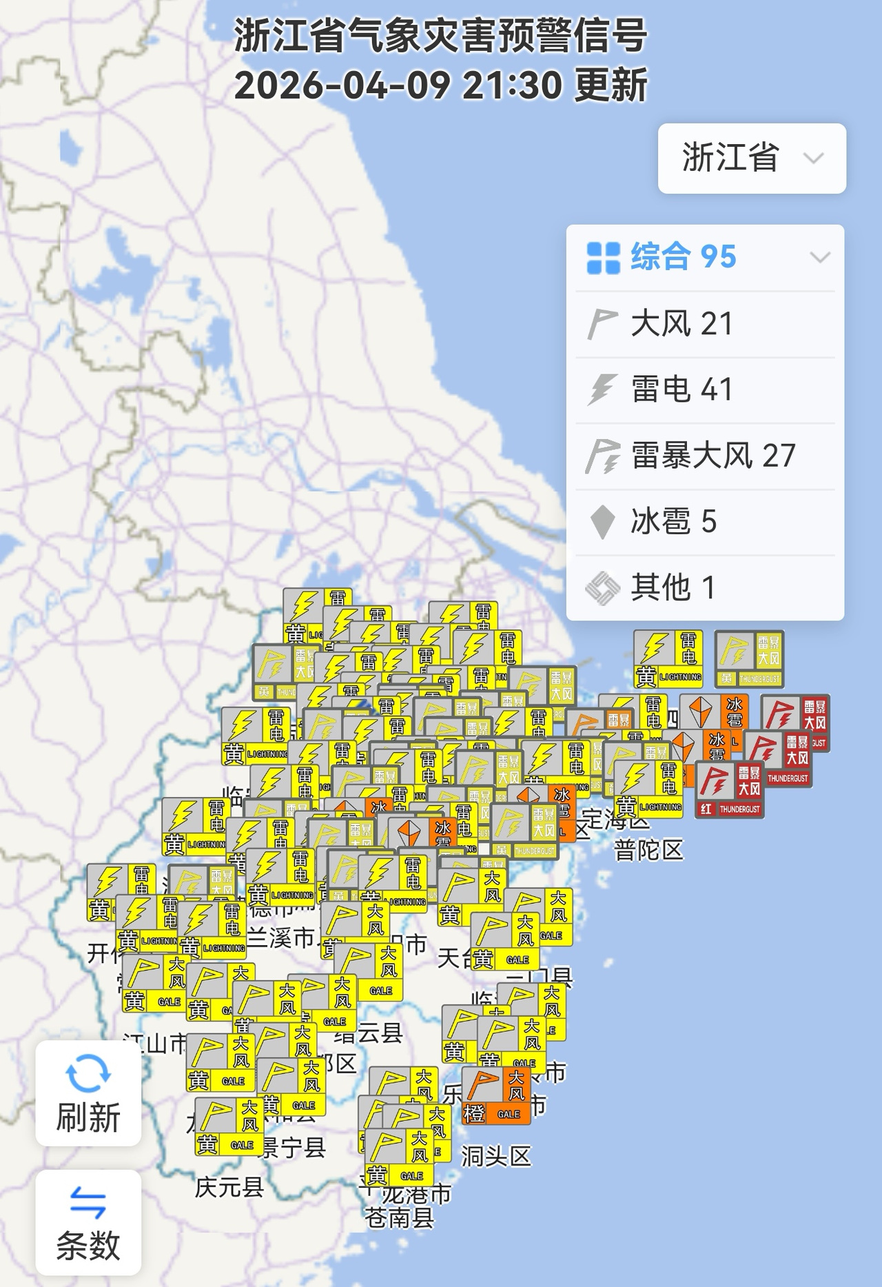 昨天傍晚到夜里浙北和浙中西部地区阴有阵雨或雷雨,部分中到大雨,局地暴雨,有雷雨地区局部伴有短时暴雨、8-10级雷暴大风和冰雹。
