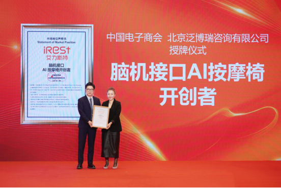 会上,iRest艾力斯特被中国电子商会授予“脑机接口AI按摩椅开创者”称号。中国电子商会数据研究院主任丁静在授牌时表示,“这一认证既是对企业自主创新的支持,也是对市场健康发展的推动。iRest艾力斯特在脑机接口与人工智能融合应用领域取得的行业领先地位,是市场选择的结果,更是消费者用实际行动投出的信任票。”