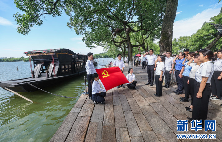 2025年6月30日,嘉兴市南湖区南湖街道新发展党员在南湖红船旁重温入党誓词。新华社记者 徐昱 摄