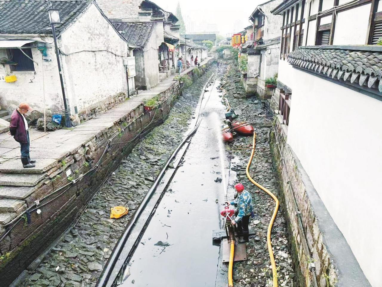 13日中午,记者来到书圣故里,在蕺坊桥边看到,施工人员正使用高压水枪冲洗河道里的淤泥,附近的居民也来帮忙平整河底的石板、石块,仍能不时看到小鱼跳跃的身影。“外河的水倒灌进来时,会带来一些小鱼小虾,昨天就有几位居民在河里抓鱼,场面还挺热闹。”周边住户沈先生笑着说。