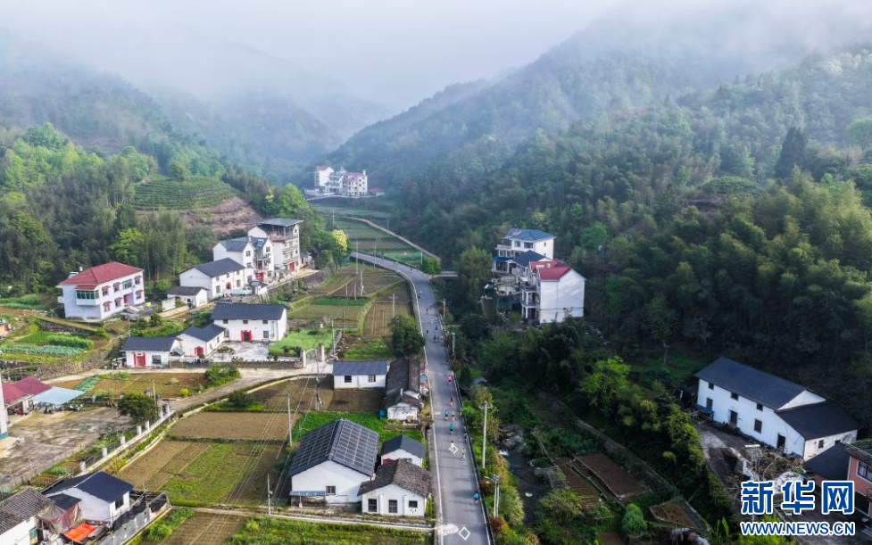 4月19日,选手们奔跑在乡村田野间(无人机照片)。