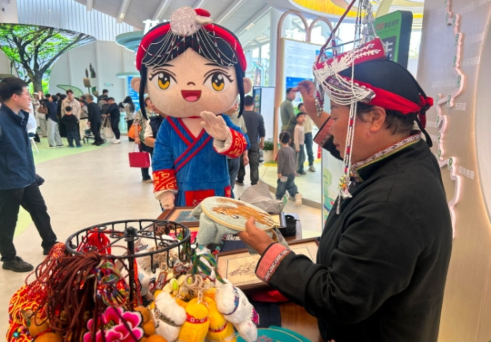 在苍南馆展区内,独具特色的民族非遗作品、琳琅满目的农特产品与创意十足的文创好物齐聚一堂。岱岭畲族乡党委委员董凡正热情地向往来游客介绍各类特色产品。“今天刚好是畲族传统节日‘三月三’,今年岱岭畲族乡还是省市‘三月三’文化活动的承办地,借此契机,特意将苍南的民族特色产品带到温州园博园。”她介绍,此次展品包括民族服饰、高山上的农产品,以及今年刚成立的在畲里工作室推出的“山歌哈妹”动漫IP形象文创产品,还有与恭王府御用团队合作制作的畲绣娃娃衣、与金乡徽章厂合作的冰箱贴等,“主要是想通过这些文创产品、农产品以及非遗作品,以文化赋能发展。”