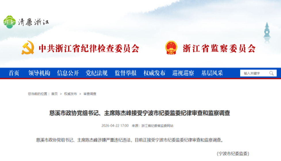 慈溪市政协党组书记、主席陈杰峰涉嫌严重违纪违法,目前正接受宁波市纪委监委纪律审查和监察调查。