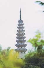 安吉著名古塔灵芝塔,始建于五代。北宋政和二年,灵芝塔旁又建成了东岳行官及行官碑。据同治十二年《安吉县志》载:“灵芝塔在顺安乡马家渡南山麓,相传五代吴越时建,虽不甚高而至今千余年,巍然独存。”灵芝塔属古代佛教建筑形式之一。它具有较高的历史、艺术和科学价值,反映了我国五代时期建筑艺术成就。该塔为楼阁式八面十层砖构实心体,通高22.46米,每层辟有一门二辟龛。并用平砖和菱角平子相间叠涩出檐,叠涩檐的五面上下均微向内倾,仍保留唐代遗风,上覆筒瓦。勾头饰宝相花,花瓣丰满。滴水饰重唇锯齿纹,钱脊饰脊兽,铁刹由覆钵、仰莲、相轮、宝瓶等组成。