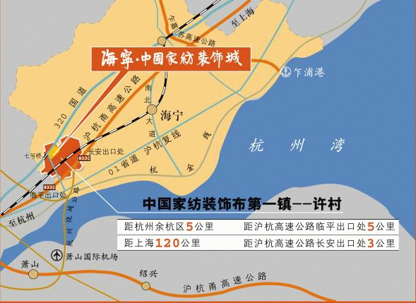 由海宁市市场开发服务中心、海宁市供销合作总社、海宁市许村工业园区开发有限公司、浙江宏达经编股份有限公司共同投资开发建设的海宁·中国家纺装饰城,是海宁市政府2001年确定的“十五”规划重点建设项目,是在浙江省区域性重点市场“浙江许村被面装饰布市场”的基础上为提升市场档次、品位和竞争力而投资兴建的全国大型的家纺装饰类批发市场。市场总体规划350亩,计划总投资3.5亿元,其中本期投资1.5亿元,建筑面积10万平方米,新建商场化铺位2000余间。市场经营定位为:装饰布、窗帘、沙发布、布艺沙发、床上用品、纺织机械。为家庭、宾馆、饭店、写字楼以及汽车等行业提供家纺装饰服务。