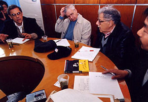 2002年3月6日上午,谢尔顿·H·哈里斯(右2)与随行的美国医学专家麦克·法兰兹布劳(右3)、马丁·法曼斯基(右4)在金华市婺城区疾病预防控制中心讨论调查事项。 |