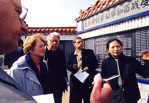 2002年3月7日,在曾被日军细菌战夺去1138名同胞的义乌市崇山村“义乌市侵华日军细菌战受害者英烈墙”前,谢尔顿·H·哈里斯(右3)与夫人茜拉·哈里斯(右4)及随行的美国医学专家们正倾听王选介绍60年前众多百姓染疫暴死的惨状。 |