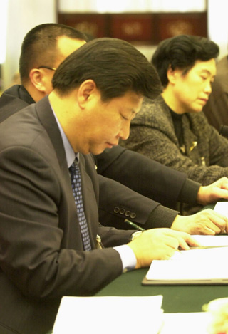 (左图)浙江省第十届人民代表大会第一次会议1月16日下午进行分组讨论。习近平代省长参加了杭州市代表团的讨论并仔细记录代表们的意见、建议。