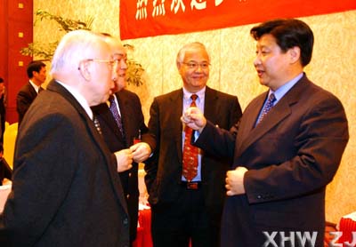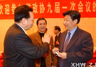 1月16日,中共浙江省委书记、代省长习近平等省领导会见出席省政协九届一次会议的全体港澳华侨委员。右图为习近平(右一)与港澳委员(右二起)金乐琦、贺一诚、顾国华亲切交谈。