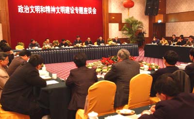 ,浙江省政协九届一次会议在杭举行专题座谈会。委员们就“政治文明、精神文明”、“社会保障”、“投资环境”和“三农”等作了专题发言。