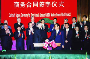 秦山三期(重水堆)核电站工程是我国首座商用重水堆核电站、中国和加拿大两国政府迄今为止合作的最大项目。它采用加拿大成熟的坎杜6重水堆核电技术,建造两台700兆瓦级核电机组,设计寿命40年,设计年容量因子85%。1998年6月8日,工程正式开工建设,2002年11月19日,一号机组首次并网发电,并于2002年12月31日投入商业运行,比中加主合同规定的55个月建设工期提前了43天。二号机组于2003年6月12日首次并网发电,并于2003年7月24日投入商业运行,比中加主合同规定的进度提前了112天,创造了国际重水堆型核电站建设周期最短的纪录。