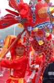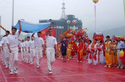 炎黄子孙舞龙迎庆石雕节开幕。 奏节歌、升节旗