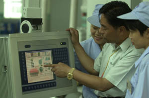 图为该村党委书记王鑫炎(左2)在指导村办企业职工使用全电脑控制的现代化设备。