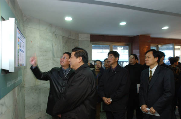 中共浙江省委书记习近平(左二)、副书记梁平波(右三)、常委、秘书长张曦、常委、宣传部长陈敏尔等在新华社浙江分社社长费强陪同下观看新华网浙江频道演示屏