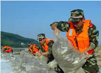 边防官兵清理受灾地区
