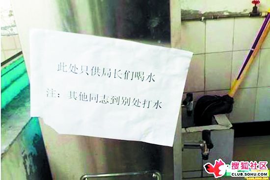 “此处只供局长们喝水,其他同志到别处打水。”――唐山市路北区交通运输局的打水点张贴的告示。这则告示近日被上传到搜狐论坛上。[详细]