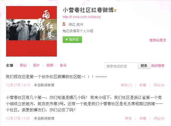 “红巷微博”开通一周,粉丝数突破200人。社区无微不至的服务,为政府赢得了支持自己的真正粉丝。[详细]