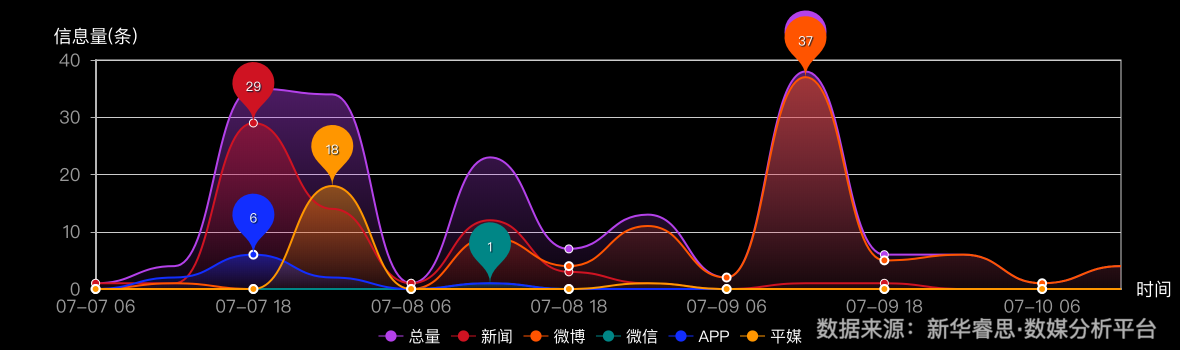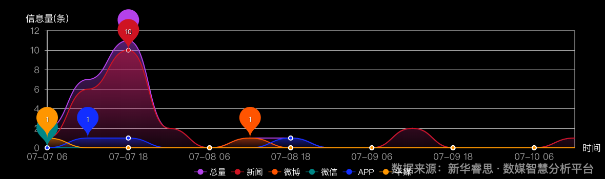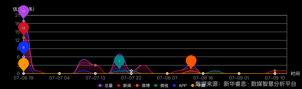 截至目前,该文章在互联网上传播时长为3天8小时,传播总量185篇,有159个媒体参与传播。其中2020-07-07 15时是传播的高峰期,共传播23篇文章。(数据来源:新华睿思·数媒智慧分析平台)
