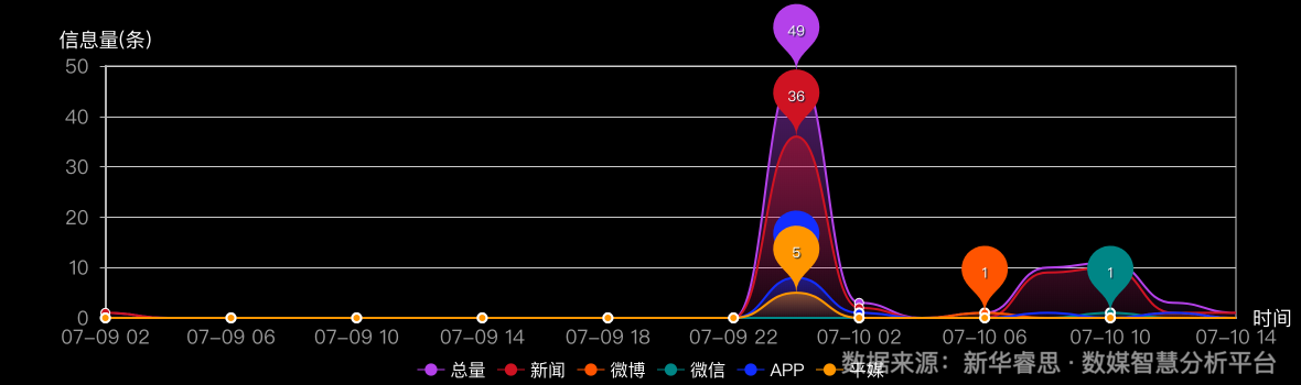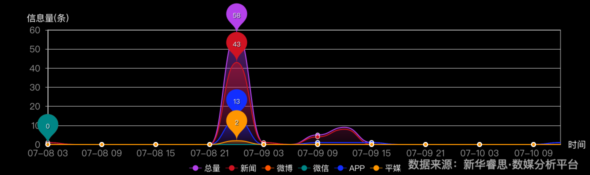 截至目前为止,该文章在互联网上传播时长为1天12小时,传播总量85篇, 有55个媒体参与传播。其中2020-07-09 22时是传播的高峰期,共传播37篇文章。(数据来源:新华睿思•数媒智慧分析平台)