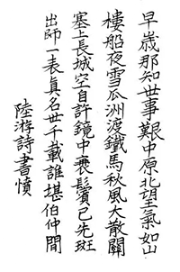 颔联两句,具体点出了自己的抗战记忆,楼船夜雪瓜洲渡,是他37岁任镇江通判时,曾亲自在焦山上观察敌人的敌舰,至今焦山之麓尚有陆游手书摩崖纪之。铁马秋风大散关句,孝宗乾道八年,王炎以枢密使出任四川宣抚使,陆游曾亲临大散关前线,研究抗敌策略。