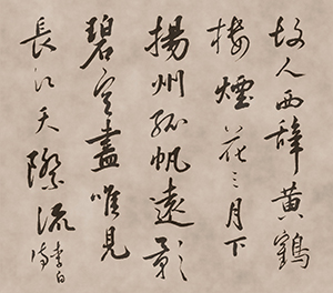 诗人举重若轻,将楚地吴天尽收于短短的四句诗中。首句说友人孟浩然辞别黄鹤楼开始东行,次句描写阳春三月,友人一路江行的旖旎风光。后两句写隐没于碧空尽头的孤帆和与天相接的江流,则像一条无形的纤绳,缩短了黄鹤楼与扬州在读者心中的距离,使诗作描绘和包容了广阔无垠的空间。