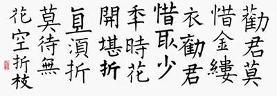 “一寸光阴一寸金,寸金难买寸光阴”,用形象的诗歌语言来揭示这个看似简单其实深刻的道理,是本诗最大的特色所在。清代学者陆昶评价此诗说:“词气明爽,手口相应,其‘莫惜’‘惜取’‘堪折’‘须折’‘空折’,层层跌宕,读之不厌,可称能事。”