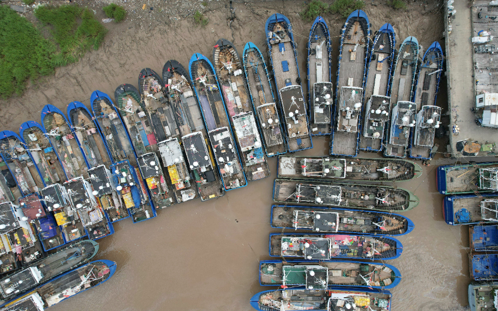 7月25日,在浙江省瑞安市东山渔港码头,渔船停泊在港区避风(无人机照片)。新华网发 庄颖昶 摄