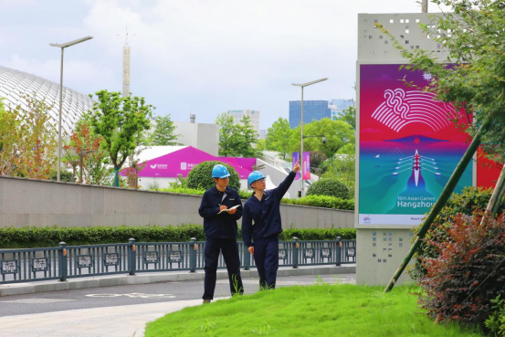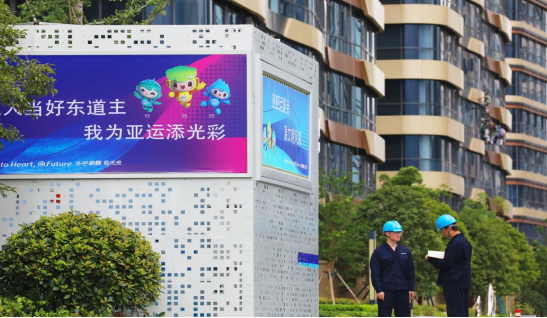 与人们平日里见到的配电箱不同,改造后的“亚运靓箱”采用了独特的简约水墨设计和渐变色彩绘艺术,并结合亚运图案和吉祥物等宣传画面,与道路对面的杭州奥体中心游泳馆遥相呼应。同时,在箱体的宣传窗口还张贴有亚运、绿色低碳元素的海报,成为杭州亚运场馆周边颇具特色的微景观。