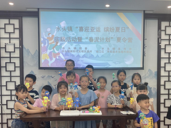 为使青少年儿童进一步了解亚运、走进亚运,营造迎亚运的浓厚氛围,近日,“喜迎亚运 缤纷夏日”实践活动暨“春泥计划”夏令营在温州市平阳县水头镇章岙村文化礼堂拉开帷幕,20多名小朋友体验到黏土DIY亚运吉祥物的乐趣。