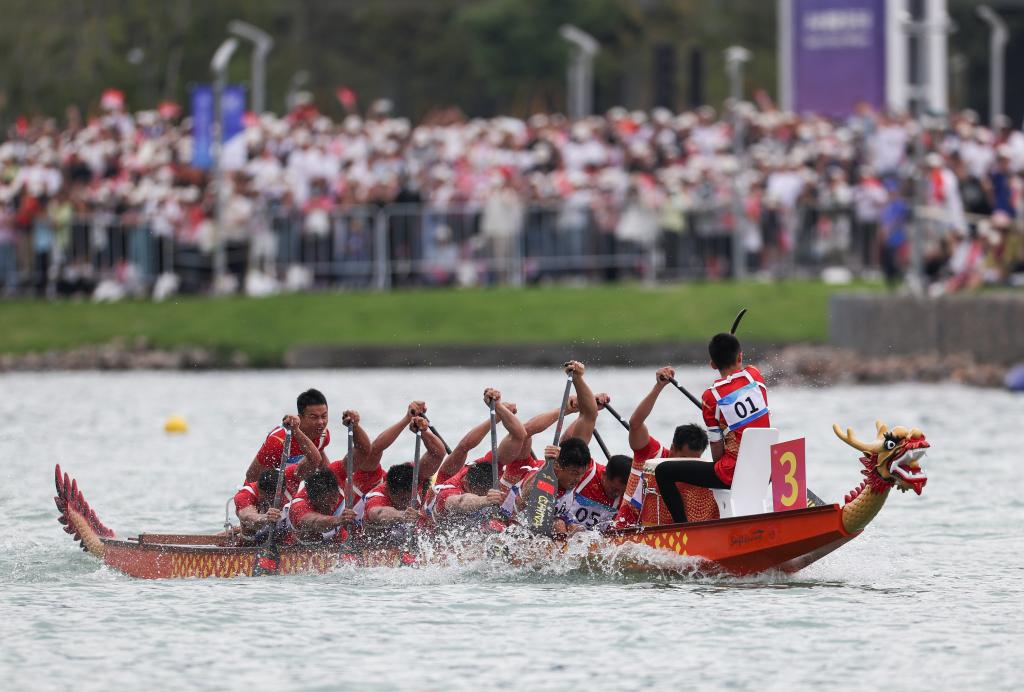 10月5日,在杭州亚运会男子组12人龙舟500米直道竞速赛中,中国队以2分09秒152的成绩获得冠军。图为中国队在比赛中。新华社记者 孟晨光 摄
