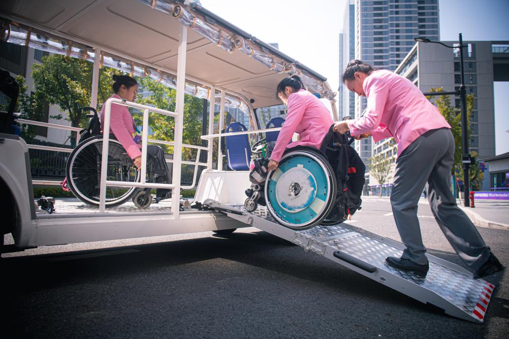 10月16日,中国体育代表团成员在杭州亚残运村内乘坐无障碍接驳车出行。新华社记者 江汉 摄