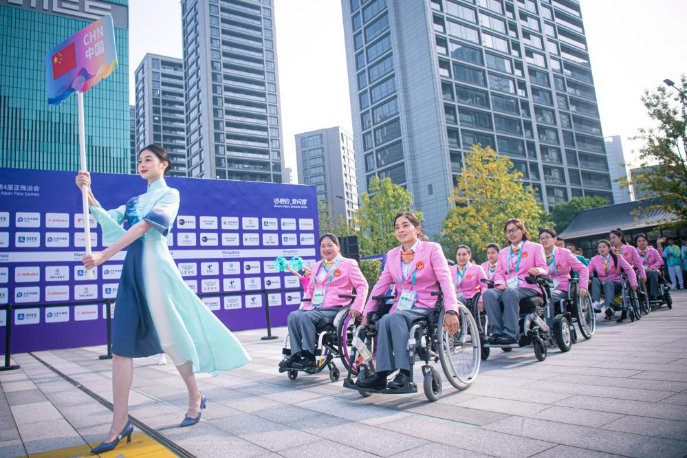 10月16日,杭州亚残运村举行开村仪式暨中国体育代表团欢迎仪式,图为中国体育代表团成员在仪式前入场。新华社记者 江汉 摄