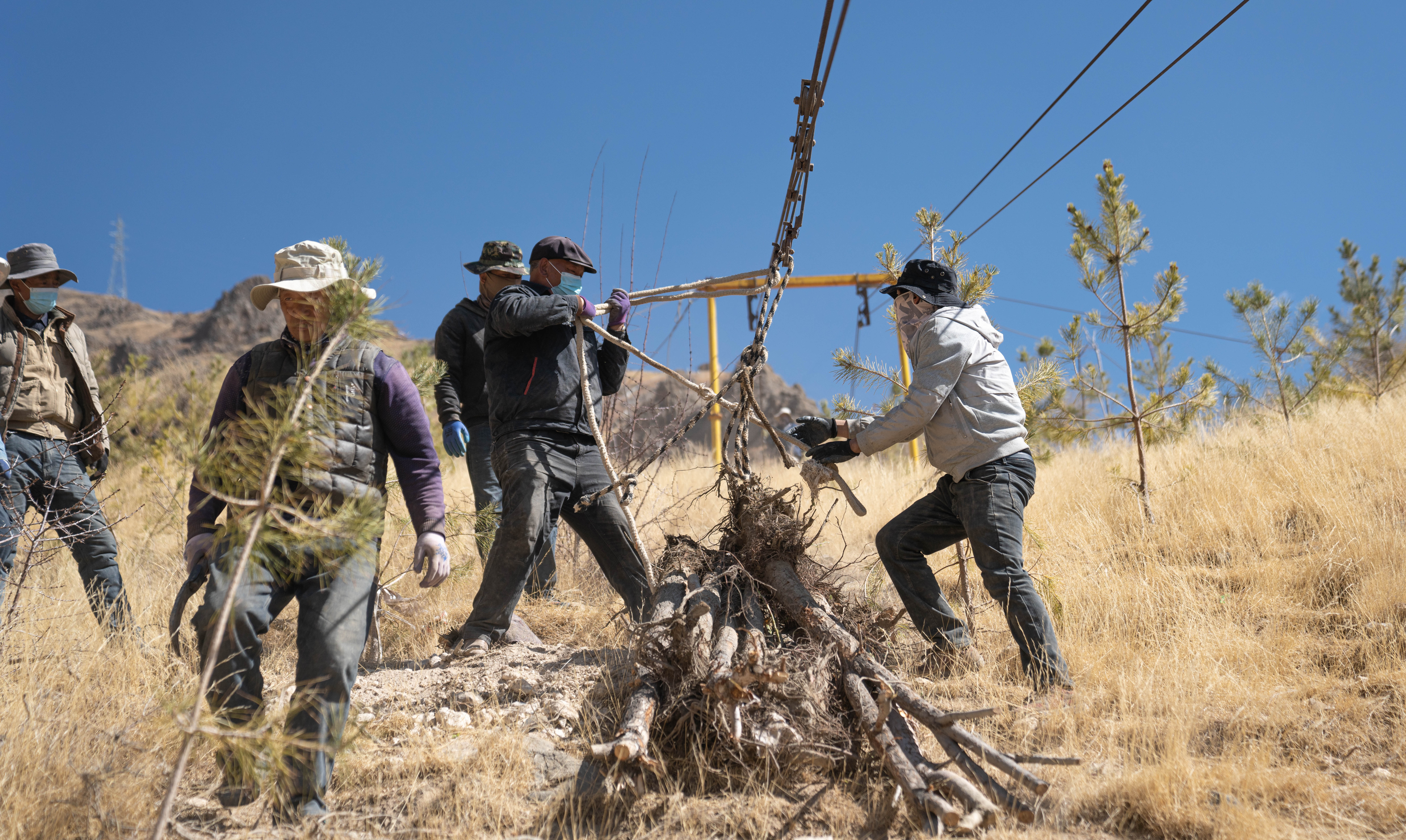 在半山坡进行索道运树的居民多吉说,西嘎山山势陡峭,架设索道后,几分钟就可以把树苗运上山,大大提高了效率和安全,现在每天都会向山上运输约2000棵树苗。