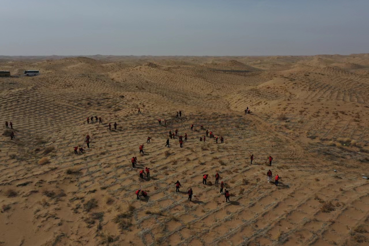 武威市凉州区的志愿者们正在沙区植树。(武威市凉州区林业和草原局提供)