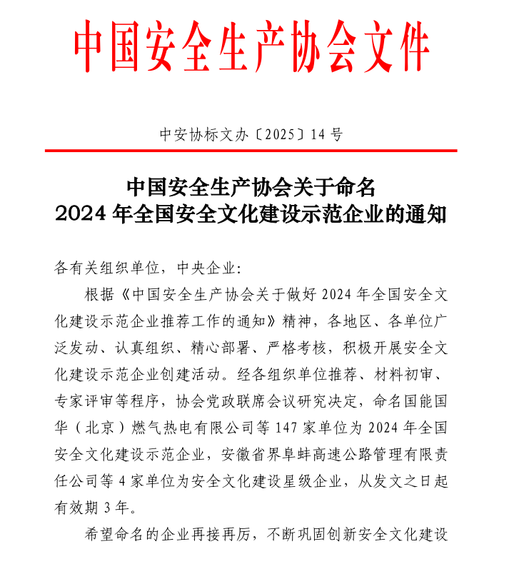 近日,中国安全生产协会发文,浙江交工金筑交通建设有限公司(以下简称交工金筑)获“2024年全国安全文化建设示范企业”称号。