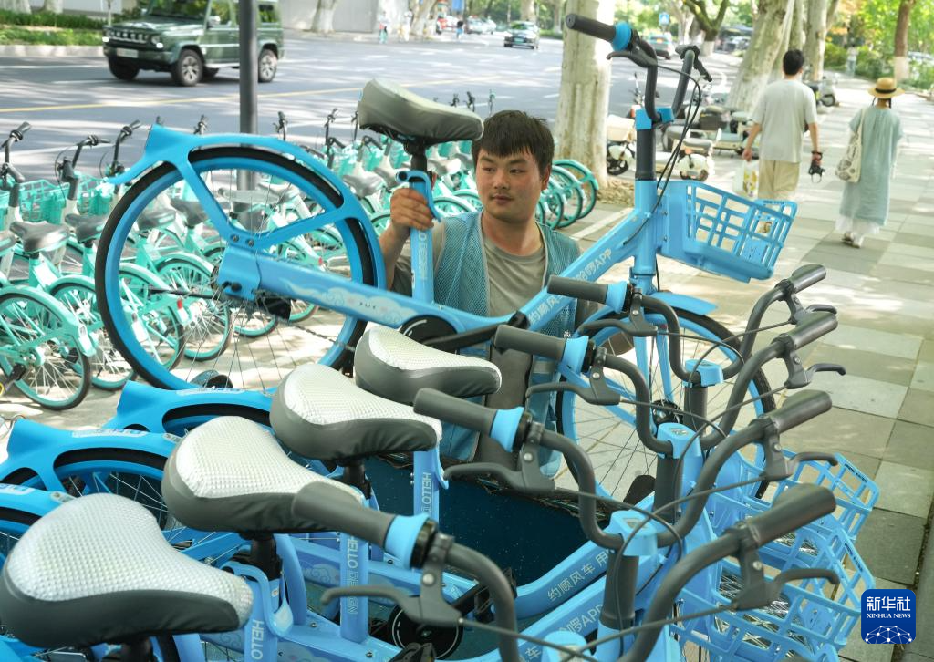 6月17日,工作人员在杭州西湖边为共享单车安装清凉坐垫。