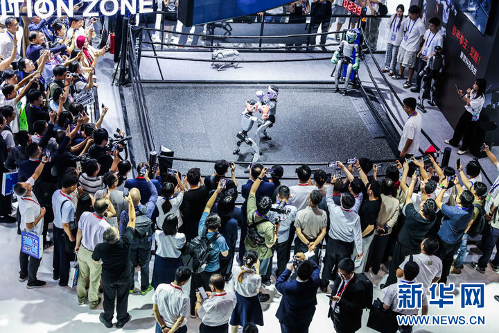 2025年9月25日,在第四届全球数字贸易博览会数智未来主题展区的杭州六小龙专区,观众观看宇树科技的人形机器人进行格斗擂台赛。新华社记者 徐昱 摄