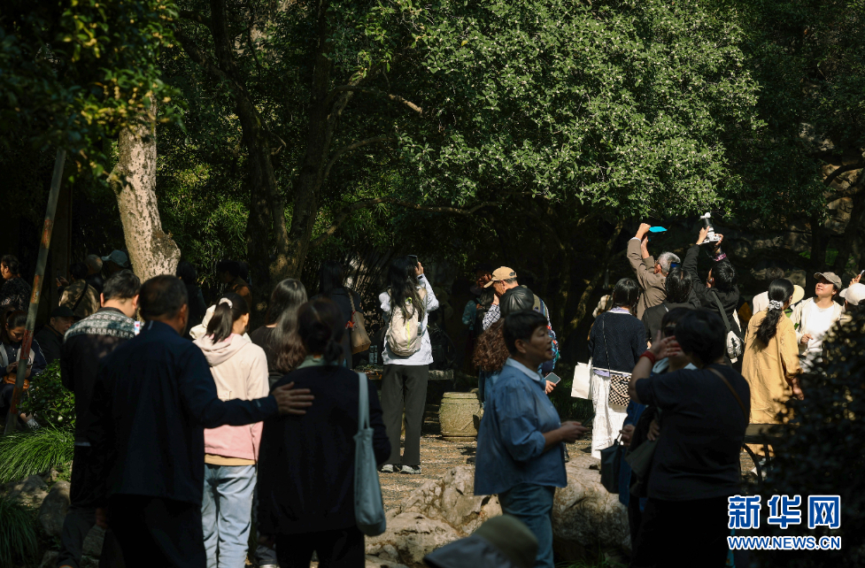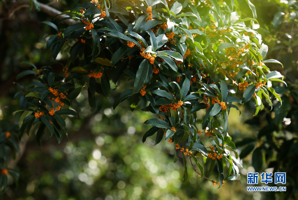 桂花枝叶繁茂,金黄点点,吸引游客驻足。新华网发 夏越峤 摄