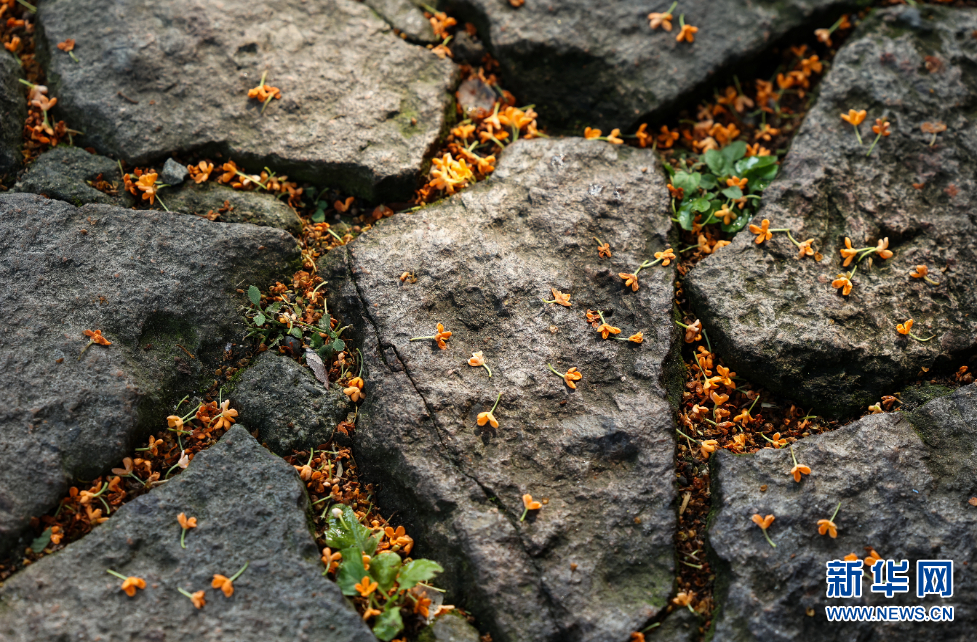 下满觉陇景区石阶上落下的金桂花瓣。新华网发 夏越峤 摄