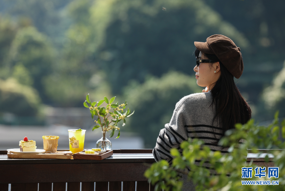 一游客在杨梅岭打卡桂花系列甜品,享受秋日甜蜜。新华网发 夏越峤 摄