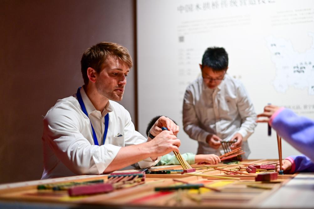 走进之江文化中心的非遗馆,阿拉巴马州青年代表戴维斯·帕克体验拼装中国木拱桥模型。帕克感叹:“这种无需钉子的结构设计体现了极高的智慧。”巴尔的摩姐妹城市协会主席约翰·法塞洛在馆内不断提问,不时点头称赞:“中国对历史的保护与传承,正是可持续发展的文化底色。”