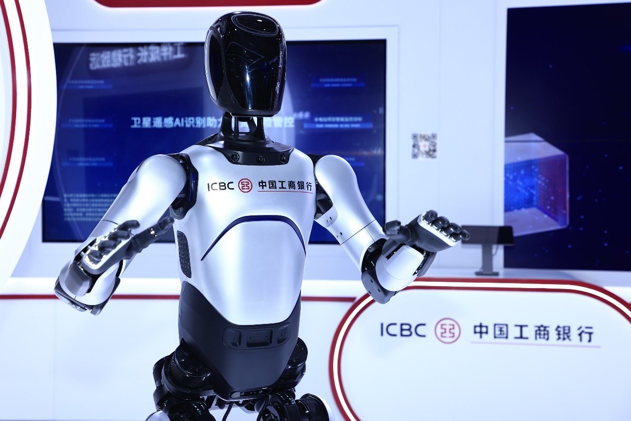 具身智能机器人化身工行“AI领航员”,引领来宾走进工行描绘的数字金融未来图景。