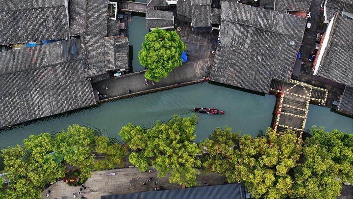 乌篷船行驶在安昌古镇的河道上。新华社记者 王迎 摄