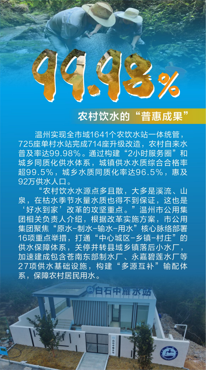 一张供水网覆盖全域,六大水源互联互通,农村自来水普及率达99.98%,城乡供水水质同质化率达96.5%……2025年以来,浙江省温州市以“好水到家”公用服务改革为抓手,推动城乡供水从“源头”到“龙头”全面升级。一组组数据背后,是温州在公用事业一体化改革中交出的精彩民生答卷。